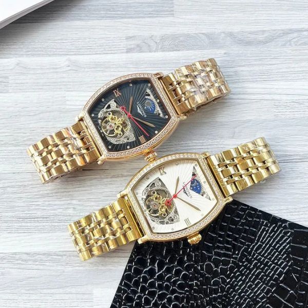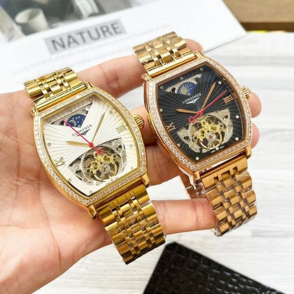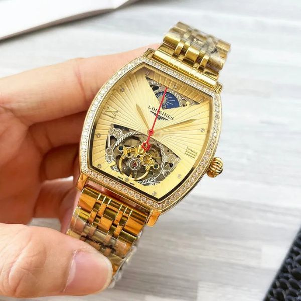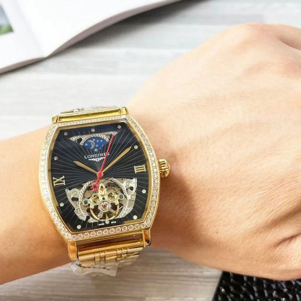 Entre na elegância com o Empyrean Skeleton Timepiece — um relógio masculino marcante que combina design refinado com a arte mecânica. A caixa em formato de caixa, emoldurada por cristais brilhantes, abriga um movimento lindamente exposto que expõe o intrincado funcionamento interno do tempo. Este modelo excepcional apresenta um mostrador sunburst com detalhe das fases da lua, algarismos romanos e uma cativante janela de coração aberto. Sua caixa e pulseira em aço inoxidável banhado a ouro adicionam grandiosidade, enquanto o fundo esqueletizado revela todo o trabalho artesanal. Ideal tanto para colecionadores quanto para criadores de tendências que buscam impacto.