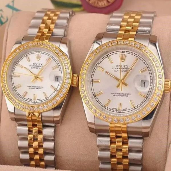Celebre a conexão atemporal com este relógio deslumbrante projetado para casais. Seu mostrador radiante é emoldurado por uma luneta brilhante cravejada de diamantes e complementado por uma luxuosa pulseira bicolor, tornando-o um símbolo de elegância e união duradouras.