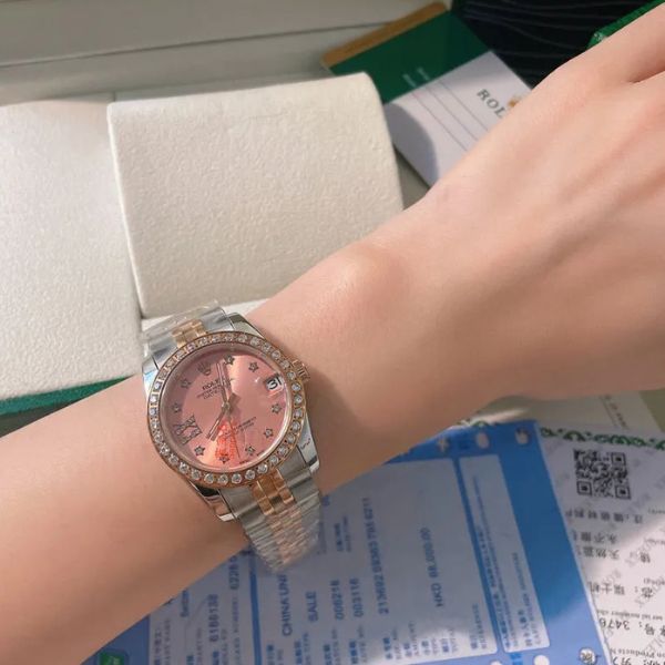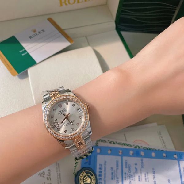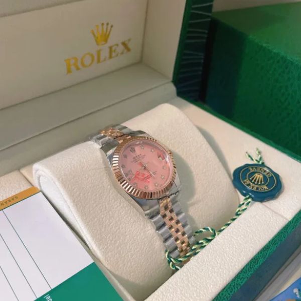 Celebre a elegância com o Rose Stellar Timepiece – um relógio de pulso feminino refinado, projetado para quem aprecia a beleza atemporal. Com um mostrador rosa de 31 mm, envolto em uma luneta cravejada de diamantes e uma clássica pulseira Jubilee bicolor, este relógio é luxuoso e feminino.