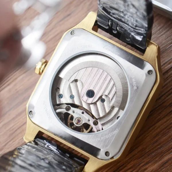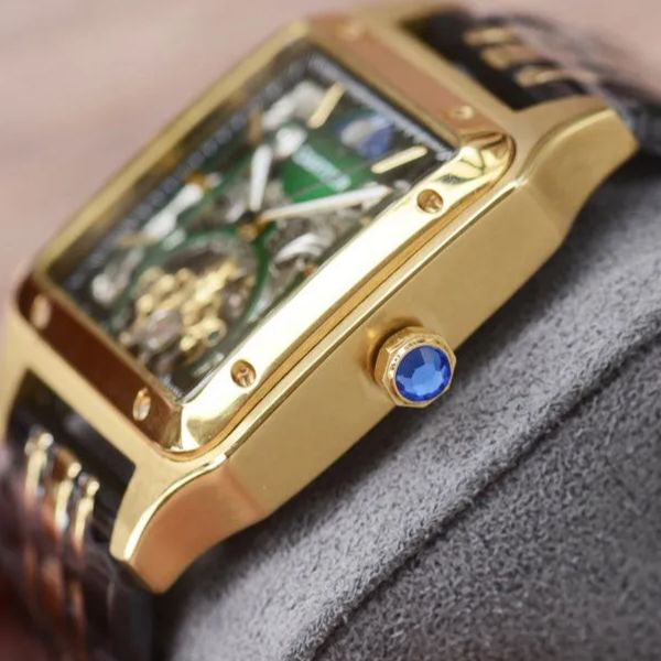 Entre em um mundo de engenharia refinada com este relógio esqueleto ousado e distinto. Criado para colecionadores e visionários, o design revela a complexidade do seu movimento mecânico através de um mostrador transparente emoldurado em tons dourados.